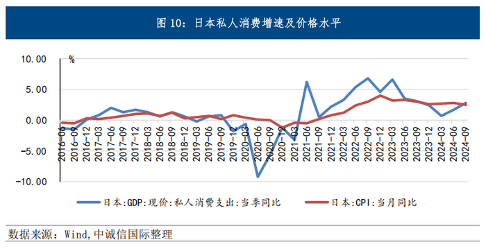 居民消费对美、日、德等发达经济体的经济增长起到关键拉动作用,显著高于投资和净出口。具体来看,在大多数年份,美国居民消费对GDP增长的拉动均超过私人投资、政府消费支出和投资,以及净出口,是美国经济增长的主要动力。2023年美国私人消费支出对GDP的拉动为1.72个百分点,显著高于同期私人投资和净出口对GDP的拉动,二者分别为0.02个百分点和0.49个百分点,2024年进一步提升至1.87个百分点。与美国类似,私人和家庭消费一直也是日本经济中占比较大的板块,多数时间里日本家庭和私人消费对GDP增长的拉动超过公共投资和净出口。在疫情以前的常规年份里,德国家庭消费支出对GDP的拉动也高于资本形成总额和净出口对GDP的拉动,2019年四季度,德国家庭最终消费支出对GDP的拉动为0.6%,同期资本形成总额和净出口对GDP的拉动仅为-0.3%和-0.2%。