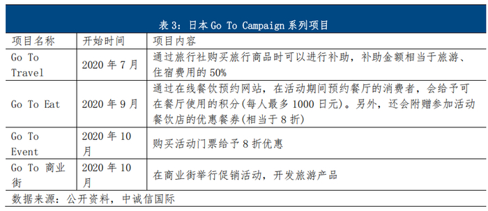 从定向扶持看,支持领域主要为旅游及餐饮业,通过财政补贴提振相关行业消费需求。2022年7月,日本面向所有日本居民推出1.7万亿日元“Go To Campaign”综合补贴政策,支持旅行、餐饮、住宿、文娱等各类消费子行业修复。比如“Go To Campaign”的子项目“Go To Travel”,就是针对遭受到较大损失的旅游行业进定向支持,从而带动区域经济恢复。“Go To Travel”项目于2020年7月开始实施,并规定在指定的旅行社购买商品可获得一定补贴;但随着日本防控政策升级,全国性的“Go To Travel”项目于2020年12月暂时中止,取而代之的为“县民折扣”,即各都道府县在中央政府的补助金之后,由地方政府根据当地具体情况推动开展相关优惠措施,避免长距离跨区活动造成病毒进一步传播和交叉感染。“县民折扣”于2021年4月开始实施,并于2022年10月升级为全国性旅游支持,不再受区域限制,有利于刺激旅游业加速恢复,带动日本消费增长。而“Go To Campaign”的子项目“Go To Eat”则是针对餐饮行业实施的消费政策,其形式可分为两种:一是线下用餐后给予平台积分返点,积分可按一定比例兑换为现金用于下次餐饮消费;二是以低价购买高价餐饮券,在指定场所进行消费,该项目于2020年9月开始实施,涉及金额约2000亿日元。