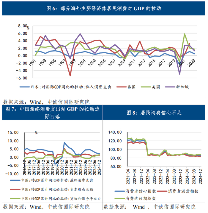 消费已成为中国经济增长的主要动力之一,但近几年内需不足特别是终端消费疲弱持续成为制约中国经济的修复。随着国内外经济环境的变化,中国经济发展经历了深刻的结构性变革,逐渐从以往过于依赖投资和出口拉动向更多依靠国内需求特别是消费需求拉动转变,当前消费已成为中国经济增长的主要动力之一。与全球其他主要经济体相比,中国居民消费对GDP拉动作用并不弱,近年来中国居民消费对经济的拉动作用总体高于投资和净出口。但疫情以来,企业盈利偏弱且投资信心不足,同时受就业承压、居民收入增长受限、房地产等资产价格持续低迷等因素影响,居民消费能力和意愿偏弱,内需不足尤其是消费偏弱持续成为扰动中国经济修复的关键因素。从三大需求对经济增长的贡献率来看,尽管改革开放以来,最终消费支出对国内生产总值增长的贡献率呈现出逐步上升的趋势,从1978年的38.8%上升至2023年末的85.6%,最终消费支出逐渐替代资本形成总额成为国民经济增长的主要动力,但2023年以来消费对经济增长的贡献有所走弱,2024年最终消费支出对经济增长的贡献率仅为44.5%,从对GDP同比的拉动来看,2024最终消费支出对经济增长的拉动为2.2个百分点,均显著低于改革开放以来的平均水平[3] 。其中2024年居民消费支出对经济增长的拉动约为1.56个百分点(按居民消费占最终消费比重为70%估算),低于2023年居民消费对经济增长的拉动1.6个百分点,较疫情前的2019年的常态水平相比也回落了0.9个百分点。而2024年美国消费对GDP同比的拉动为1.87个百分点,较2023年上升0.15个百分点,较2019年上升0.42个百分点,或表明疫情对我国消费的冲击较大。