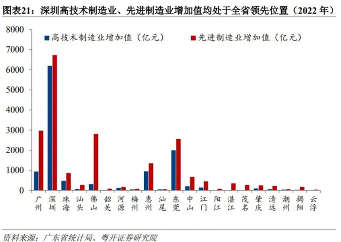 2022年,深圳规上高技术制造业增加值占全省的61.3%,超过其余20个地级(副省级)市之和,且占本市规上工业的60%以上。而广州高技术制造业增加值仅占本市规上工业的19%,位列全省第四。