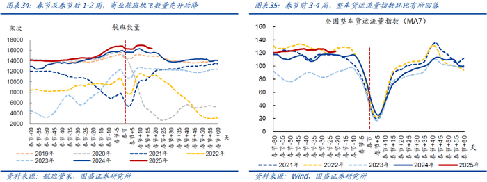 >人员流动:春节及春节后1-2周,商业航班执飞数量均值环比回落1.1%,绝对值仍为同期最高、约为2019年同期的110.7%;货运流量指数本期仍然暂停更新。