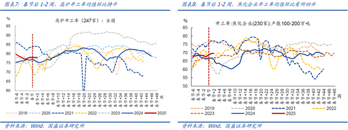 >中上游看,春节后1-2周(对应阳历2025年2月2日-2025年2月16日),247家高炉开工率均值环比持平前值78.0%,相比2024年、2019年同期分别偏高2.0、0.6个百分点。焦化企业开工率均值环比回升2.0个百分点至69.6%,相比2024年同期仍然偏高3.1个百分点、相比2019年同期偏低7.1个百分点。水泥粉磨开工率均值环比续降0.7个百分点至7.6%,环比降幅小于2018-2024年同期均值的4.1个百分点,相比2024年、2019年分别偏低0.8、5.3个百分点。