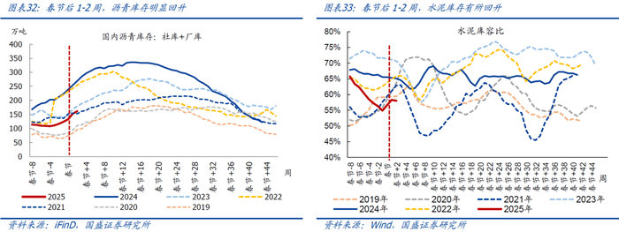 沥青、水泥库存有所回升。春节后1-2周,沥青库存(厂库+社库)均值环比回升28.0万吨至约156.4万吨,相比2024年同期仍然偏低112.8万吨。水泥库容比均值环比回升3.3个百分点至58.2%、再创同期新低,相比2024年同期降幅收窄至7.0个百分点。