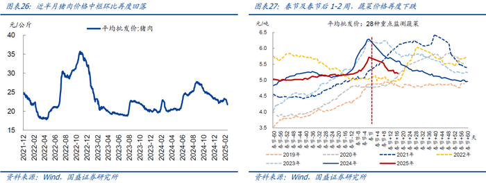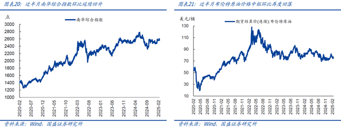 下游消费品:春节过后,猪肉、蔬菜价格环比再度下跌。近半月来,猪肉价格均值环比再度回落2.0%至约22.5元/公斤,相比2024年同期再度偏低0.9%。蔬菜价格均值环比再度下跌1.7%,仍然弱于季节规律(2019-2024年同期均值为涨2.5%),相比2024年同期偏低约5.9%。
