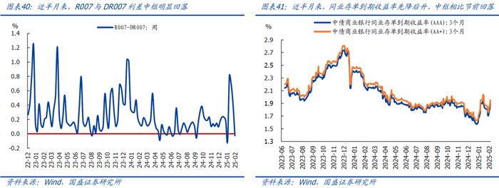 货币市场利率:春节假期结束,货币利率明显回落;然而,由于央行加大流动性回笼、大行融出偏少等影响,资金利率仍然偏高。近半月来,DR007、R007、Shibor(1周)中枢环比分别回落88.8bp、28.4bp、24.0bp,绝对值仍然明显高于7天逆回购利率(OMO),指向资金价格仍然偏贵。节后R007、DR007利差中枢显著回落,主因节后流动性分层现象有所弱化,此外,非银机构融出增加,也在一定程度强化了R007利率回落。同业存单到期收益率环比先降后升、中枢有所回落,3月期AAA、AA+同业存单到期收益率中枢环比同步回落9.5bp,节后由于资金再度偏贵,同业存单到期收益率再度回升。