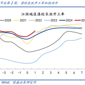 >从江浙涤纶长丝开工率看,节后第一周为80.3%,较往年(2021、2022、2024)同期的82.4%略偏低;第二周为86.9%,基本持平往年同期水平,也指向第二周纺织生产复工明显加速。