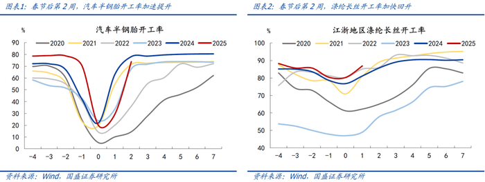 > 从汽车半钢胎开工率看,节后第一周为29.4%,较2023-2024年同期的48.4%明显偏低;第二周为73.9%,基本持平2023-2024年同期水平,指向第二周汽车生产复工明显加速。