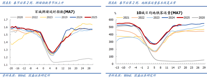 > 从地铁客运量看,节后第一周为397.3万人,较2023-2024年同期增长10.4%;节后第二周为528.4万人,较2023-2024年同期增长7.4%,指向假期居民出行较为活跃,节后基本恢复正常。