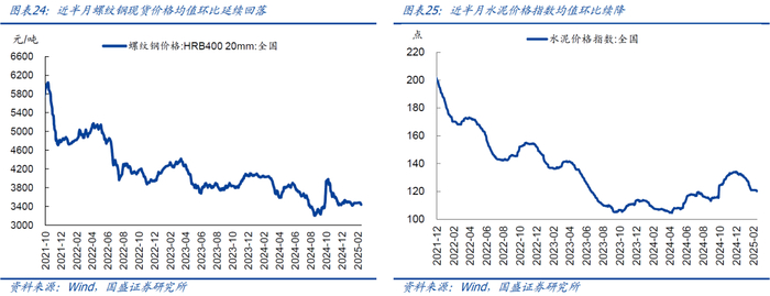 由于春节假期影响,上游开工多数先降后升、中枢有所分化。近半月来(春节后1-2周,对应阳历2025年2月3日-2025年2月16日),全国247家样本高炉开工率均值环比持平前值78.0%,相比2024年、2019年同期分别偏高2.0、0.6个百分点。焦化企业开工率均值环比回升2.0个百分点至69.6%,相比2024年同期仍然偏高3.1个百分点、但相比2019年同期偏低7.1个百分点。水泥粉磨开工率均值环比续降0.7个百分点至7.6%,环比降幅小于2018-2024年同期季节性(均值为环比下降4.1个百分点),相比2024年和2019年同期分别偏低0.8、5.3个百分点。