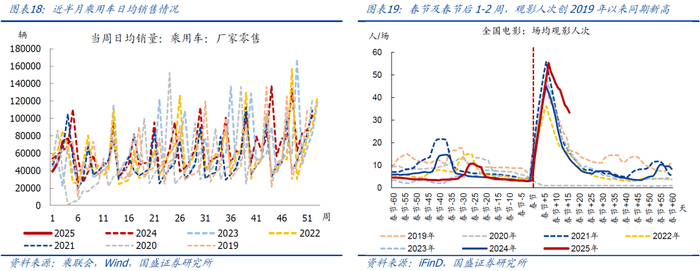 人员流动:春节之后,航班数量先升后降、中枢有所回落。春节及春节后1-2周,商业航班执飞数量先升后降、中枢相比节前有所回落,均值环比回落1.1%至约16480架次/日,仍为有数据以来同期最高;相比2024年同期偏高约4.7%,约为2019年同期的110.7%。