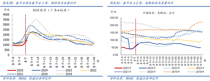 钢材、电解铝库存均显著回升,强于季节规律。春节当周及春节后1周,钢材库存环比增加42.3%,录得1441.3万吨,仍为近年同期最低,相比2024年同期降幅收窄至3.7%。春节后1-2周,电解铝库存环比增加54.2%、显著强于季节规律(2017-2024年同期均值为-2.5%),绝对值仍为近年同期次低,相比2024年同期水平偏高5.6%。