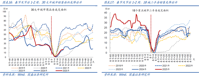 30大中城市新房销售面积均值先降后升、走势跟2024年同期类似。由于假期影响,春节及春节后1-2周(2025.1.29-2025.2.15),30大中城市新房日均成交面积先降后升、中枢相比节前显著回落,环比下降56.2%,降幅大于近年同期均值(2019-2024年同期均值为-54.6%),相比2024年同期仍然偏高15.3%。往前看,2025年1月以来,30大中城市商品房日均成交面积约为18.7万㎡,相比2024年同期偏低13.2%,整体趋势跟2024年同期相似,指向新房销售内生修复动能仍然不足,持续性仍待观察。