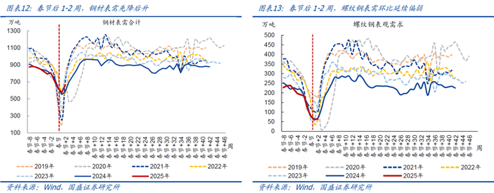 钢材表观需求环比续降、降幅小于近年同期均值,螺纹钢需求显著偏弱、绝对值续创同期次低。春节后1-2周,钢材表需先降后升、均值环比回落6.9%至约619.5万吨,环比降幅小于同期均值(2019-2024年同期环比均值为降22.5%),绝对值处于近年同期偏高水平,相比2024年和2019年同期均值分别偏高8.9%、25.8%。其中,由于春节假期影响,螺纹钢表需均值环比续降36.1%至约62.5万吨,降幅大于近年同期均值(2019-2024年同期环比均值为降32.3%),绝对值续创同期次低(仅高于2022年同期),相比2024年、2019年同期分别偏低6.9%、63.9%。