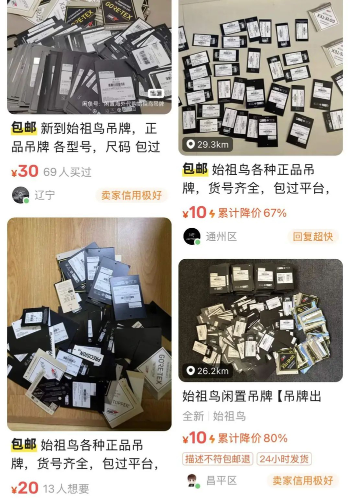 尤其适用于始祖鸟假货泛滥的市场里,正如鉴定师Ye神指出,“买卖吊牌或许是为通过得物审核,但用来造假仿制和方便二手衣服售卖的可能性应该更高。”