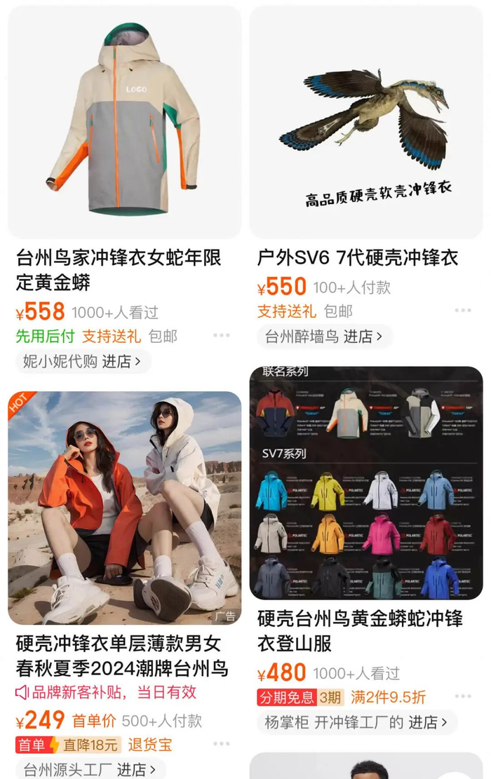 据大量网友反馈,如今台州鸟“已经做得和始祖鸟差别很小,但价格低,500元左右就能拿下一件质量不错的冲锋衣。”