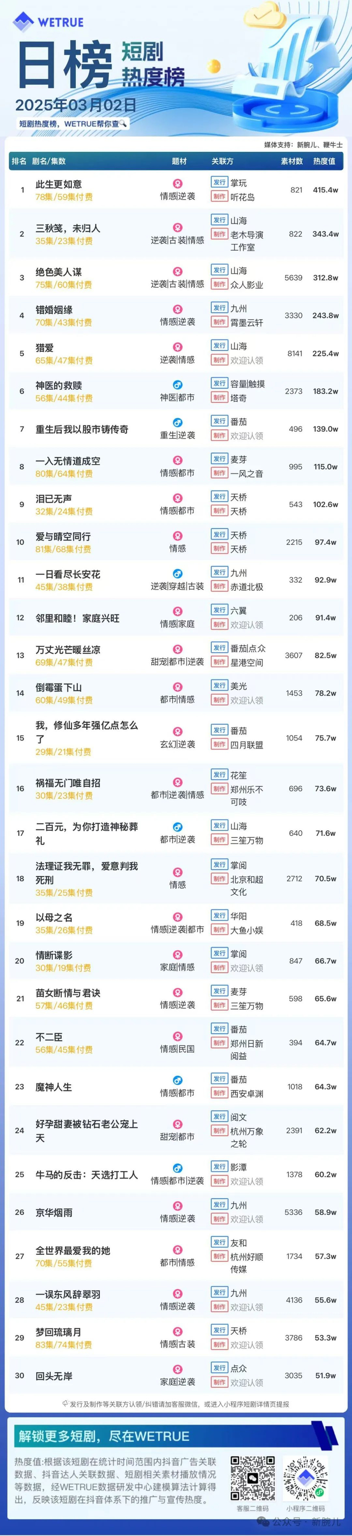 3月3日消息,为帮助短剧从业者提供更多信息,专注于短剧报道的新腕儿和科技媒体鞭牛士联合WETRUE短剧热度榜共同推出付费短剧热度榜。