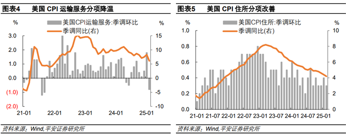 结构上,本月通胀的改善较为全面,能源、食品、核心商品、核心服务、“超级核心服务”等环比均放缓。具体来看,2月CPI分项中,能源、食品分项环比为0.2%,较前值均有下降。核心商品环比0.2%,低于前值的0.3%。其中,新车(-0.1%)、二手车和卡车(+0.9%)、医疗用品(+0.1%)等环比增速下降,服装(+0.6%)、酒精饮料(+0.5%)和烟草(+0.6%)环比增速上升。核心服务环比0.3%,低于前值的0.5%。其中,住所(+0.3%)较前值(+0.4%)小幅下降;交通运输(-0.8%)环比则大幅下降,主因机票价格(-4.0%)大跌;医疗服务(+0.3%)增速有所回升。剔除能源和住房服务的“超级核心服务”环比增长0.2%,大幅低于前值的0.7%,同比也由4.2%下降至3.9%。