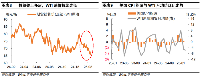 如何理解2月CPI的放缓?我们认为,需求放缓和特朗普新政可能都发挥了一定作用。需求方面,近期公布的美国经济数据整体偏弱,尤其与消费相关的零售销售、个人消费支出等数据不佳,GDPNow模型最新预测(截至3月6日)一季度GDP环比折年率-2.4%,其中消费GDP仅增长0.4%。此外,上周公布的就业数据也偏弱,薪资增速放缓,也是需求放缓的信号,为本月通胀的放缓做了铺垫。而政策方面,特朗普上任后宣布了管控通胀的行政令,尤其强调管控能源通胀。所谓“预期先行”,需求预期和供给预期共同作用之下,WTI原油2月均价(71.2美元/桶)较1月均价下跌了5.3%,而3月以来(截至12日)的均价又比2月进一步下降了5.9%,这使得能源、交运服务等通胀明显改善。