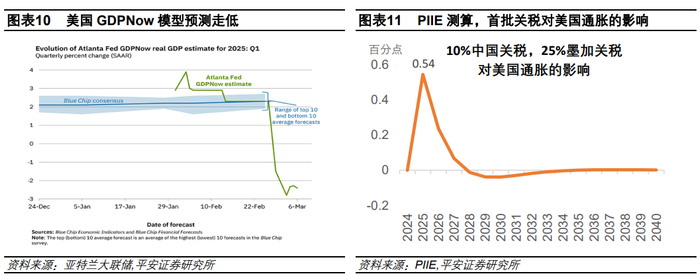 最新CPI数据有助于缓解短期滞胀的“近忧”,但难以打消市场对于关税政策引发通胀上行的“远虑”。近期市场对于美国经济的担忧加剧,其中“滞胀”的危害或高于单纯的“衰退”。在经济数据不佳的背景下,最危险的情形是通胀不合时宜地走高。幸好,本月通胀数据全面放缓,一定程度上缓解了“滞胀”这一最悲观情形的担忧。但是,这份数据并未体现美国关税政策对通胀的影响。2月以来,真正落地的关税政策只有对华加征的10%关税。据PIIE测算,对华10%的额外关税将抬升2025年美国通胀0.06个百分点(不考虑反制)。在此基础上,进一步实施对墨西哥、加拿大的25%关税,则可能总共抬升美国通胀0.54个百分点。3月以来,美国实施了对华进一步加征10%关税,以及3月12日正式宣布对所有进口钢铝产品加征25%关税。4月以后,不排除美国开始对加、墨甚至欧盟加征关税,也不排除对汽车、药品、芯片、木材、农产品等产品加征关税。综合来看,关税带来的通胀上行风险可能高达0.5-1个百分点。这一忧虑并不会因近期通胀数据的改善而消除。