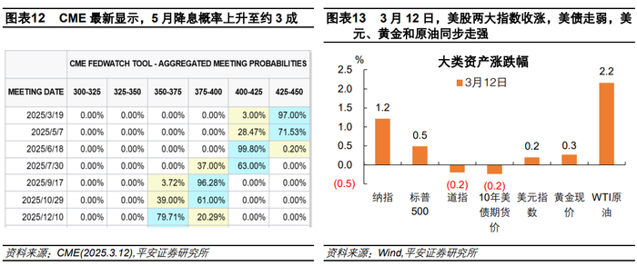 CPI数据公布后,美股紧张情绪有所缓和,但关税政策扰动下,市场降息预期反而推迟,美债利率和美元指数反弹。3月12日CPI数据公布后,美股三大指数均高开,虽然后来受到钢铝关税政策正式宣布的扰动,但纳指、标普500指数最终仍分别收涨1.22%、0.49%。不过,鉴于关税风险延续,市场降息预期不升反降。CME FedWatch显示,3月12日,3月降息概率由前一日的4%下降至3%,5月降息概率则由4成下降至3成。美元指数不降反升,日内收涨0.2%,收于103.59;2年美债收益率日内上升7BP至4.01%,10年美债收益率上升4BP至4.32%(其中通胀预期和实际利率分别贡献2BP)。