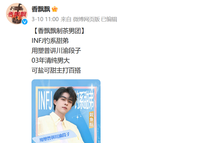 更夸张的是,对于这些颜值爆表、身材俱佳的“制茶弟弟”,香飘飘的文案介绍也令人瞠目结舌:“188音乐系男友,等你pick”、“长沙空少/在逃爱豆”、“百变发色,调色盘天选之子”、“AAA奶狗少年感批发商”、“29岁小叔系天菜”、“禁欲脸+男友力双学位拥有者”、“03年清纯男大 可盐可甜主打百搭”、“是播音系奶狗,更是野心家”……
