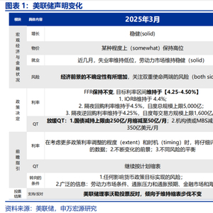 3月 FOMC 例会,联储选择以不变应万变。3月FOMC例会维持FFR目标不变、再次放缓QT。会议声明强调“经济不确定性风险有所增加”;经济和FFR预测方面,美联储上修通胀预测,下修经济预测,点阵图(中位数)不变,凸显对“临时性”滞胀的观望态度。