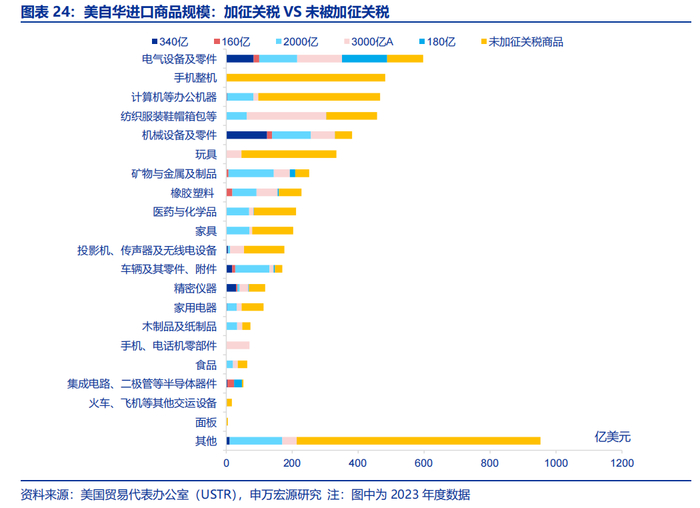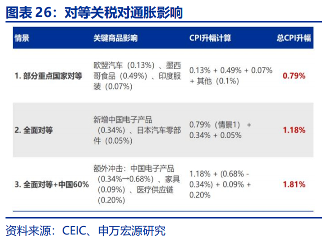 2)关税2.0背景下,中加墨关税或提升美国PCE通胀约0.3至0.7个点,对等关税或导致美国通胀抬升0.8到1.8个百分点。对比之下,此轮特朗普关税2.0对于消费品进口的冲击不可小觑,玩具、手机等典型消费品均更可能出现涨价。若美国对中国的10%及对加拿大、墨西哥的25%关税最终生效,价格完全传导的情形下,或使美国PCE通胀抬升0.7个点,50%的传导效率下,或使PCE通胀抬升0.36个点;对等关税若实施,或导致美国通胀抬升0.8到1.8个百分点。情形一,美国对重点国家实行关税对等,可能导致美国CPI通胀上升0.8个百分点;情形二,全面关税对等的条件下,可能导致美国CPI通胀提高1.2个点;情形三,在全面对等的基础上,对中国加征60%关税,可能导致美国通胀上升至1.8个点。