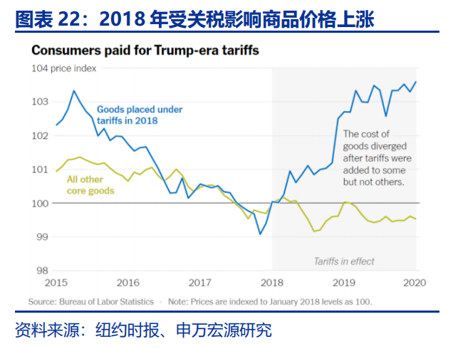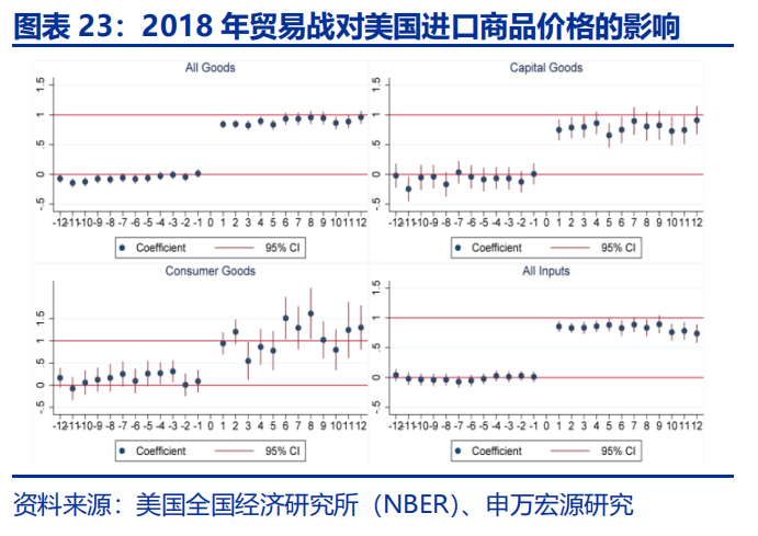 1)2018年关税对于美国核心PCE通胀推升仅在0.1-0.2个百分点左右。美国国际贸易委员会(ITC)的研究认为,关税显著提升了美进口商品的价格,且关税的主要承担者是美国的进口商和美国的消费者。特朗普关税1.0主要加征的商品更偏中间品、资本品,虽然部分消费品受到波及,但彼时关税的通胀效应尚不强劲,根据波士顿联储测算,2018年关税对于美国核心PCE通胀推升仅在0.1-0.2个百分点左右;