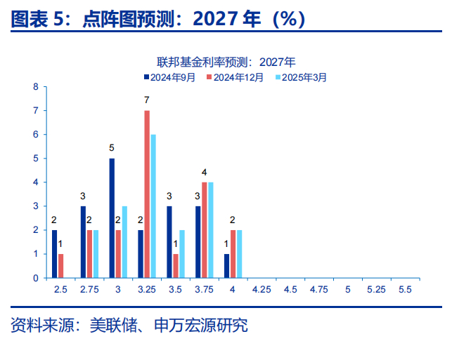 美联储上修通胀预测,下修经济预测,但点阵图(中位数)展望不变,凸显对“临时性”滞胀的观望态度。此次美联储表态最大特征在于其“观望”、“等待”的政策取向,这体现在预测中。美联储此次上修核心通胀、下修经济增速预测,展现出对经济“滞胀”的担忧,但核心通胀上修仅限于2025年,说明对通胀担忧尚不剧烈,这也体现为点阵图利率预测持平12月,增长放缓与通胀上升的担忧相互抵消。经济方面,美联储将2025、2026、2027年实际GDP增速下修0.4、0.2、0.1个百分点至1.7%、1.8%、1.8%,2025年失业率上修0.1个百分点至4.4%;通胀方面,美联储将2025、2026年PCE通胀上修0.2、0.1个百分点至2.7%、2.2%,2025年核心PCE通胀上修0.3个百分点至2.8%。点阵图方面,美联储仍预期2025年降息空间为50BP(2次降息)。