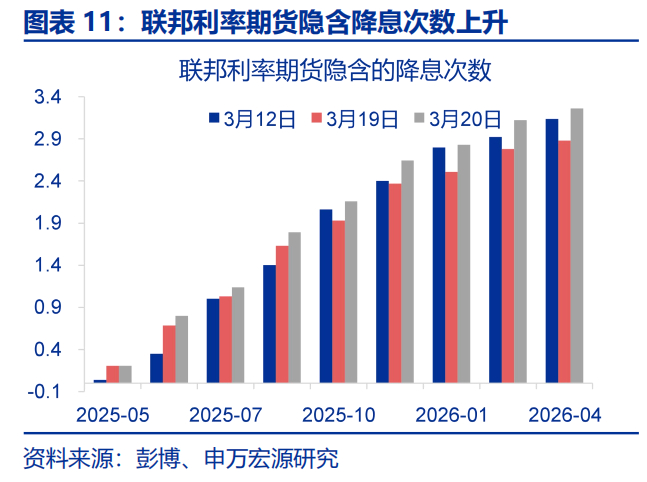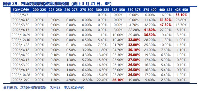 如果对等关税进一步增加经济不确定性和市场压力,可期待2025年美联储降息节奏“前置”。2018-2019年的经验显示,美联储政策及时“转鸽”有助于稳定经济预期和市场波动。鲍威尔似乎吸取了2018年9月“鹰派”加息经验,为对冲二季度对等关税扰动,将对经济不确定性的担忧“前置”,所以,美联储3月FOMC会议的最大意义在于降息时点提前。根据市场预期,下一次可能的降息时点在6月;但是,鲍威尔在记者会上也承认关税已经对通胀形成推升。所以,降息的“前置”可能并不意味着全年降息幅度的提升。由于美国通胀压力持续高企,2025年美联储全年降息空间变化不大,美联储点阵图全年预计仍在50BP,市场预期仍在75BP。