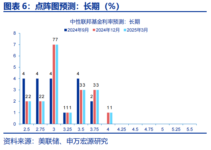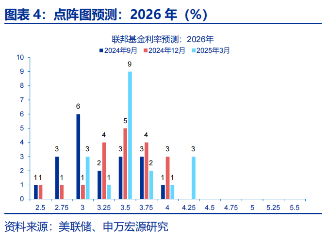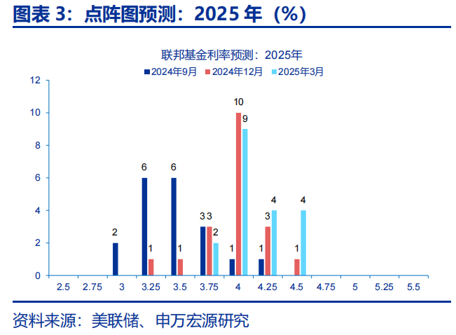 但是,从点阵图分布来看,美联储FOMC委员中认为利率维持高位的人数大幅增加。虽然美联储此次点阵图显示2025年降息空间为50BP,与去年12月会议维持一致。但是,点阵图的集中趋势(Central tendency)、预测区间均较上次有所变化,如3月预测中2025年利率区间为3.6-4.4,2024年12月为3.1-4.4。也就是说,虽然利率预测中位数不变,但在3个月前还认为2025年会大幅降息的部分委员已经改变了观点。另一方面,在此次点阵图中,认为2025年美联储降息小于等于1次的委员人数从4人增加到了8人(共19人),也可佐证看似不变的点阵图,实际上蕴含着对于利率维持高位的更强预期,凸显美联储对于通胀的担忧。