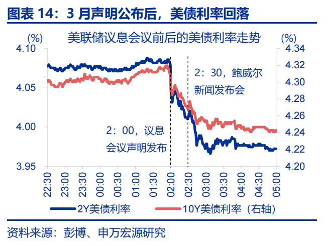 声明方面,美联储表示“经济不确定性风险”增加,宣布放缓QT步伐。此次3月美联储声明主要变化来自于两点,其一,此次声明将“经济前景具备不确定性”改为“经济前景不确定性增加”;其二,美联储决定将自4月起放缓缩表,美国国债每月赎回上限由250亿美元降至50亿美元。值得注意的是,此次声明中对于“不确定性增加”的担忧,在2019年6月美联储会议声明中也曾出现,这随后的便是2019年7月开始的“中周期调整”降息。也就是说,美联储在担忧通胀、指出经济实体仍然稳健的同时,也留下了“灵活”应变的空间。但的确,鲍威尔在记者会上表示不认为会在5月急于降息,美联储“观望”仍是基调。