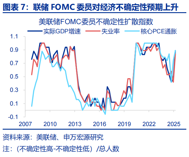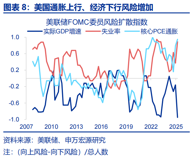 同时,美联储认为经济下行、通胀上行风险及不确定性风险大幅提升。3月美联储FOMC委员对于经济增长、通胀的不确定性担忧大幅上行。在19位委员中,有17位认为核心PCE通胀、实际GDP增速不确定性增加。在2018年6月至2019年6月的一年间(特朗普1.0关税落地-美联储降息开启),美联储FOMC委员对于经济、通胀的不确定性担忧也出现过一波上行,但明显本次会议更为剧烈;另一方面,美联储认为经济下行风险、通胀上行风险剧增。在19位委员中,有18位认为核心PCE通胀风险趋于上行,17位认为实际GDP增速风险趋于下行。