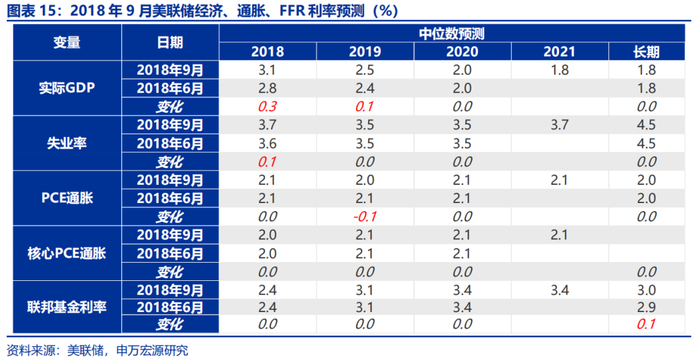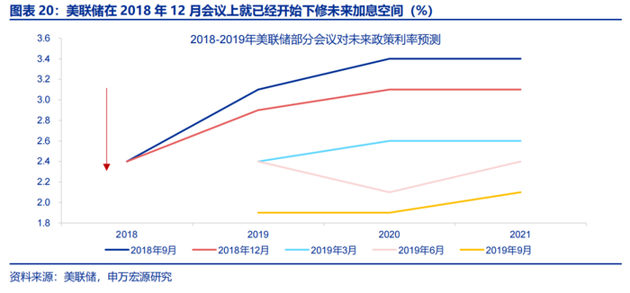 面对经济走弱、市场震荡,美联储在2018年底开始转向,2019年6月承认“经济不确定性增加”,2019年7月开启降息。鲍威尔2018年11月出席纽约经济俱乐部活动时指出利率仅“略低于”中性利率水平,传递偏鸽信号。美联储2018年12月会议虽然仍加息25BP,并预期将在2019年加息2次,但加息次数、经济增速预测均已经出现下调。美联储2019年1月会议声明删除了继续加息的表述,2019年3月会议的点阵图“实锤”美联储不再预期2019年将加息。表述上,美联储2018年11月后陆续将企业投资描述为放缓(moderated)、回落(slower)、疲弱(soft),以及提示出口、通胀较弱。