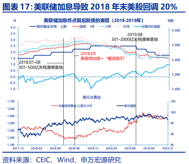 2018年9月,鲍威尔选择“鹰派”加息,叠加关税对经济冲击体现,导致市场大幅波动。2018年,特朗普在7、8、9月陆续加征了三批关税,但美联储2018年9月会议仍选择“鹰派”加息,上修经济预测,声明中认为美就业、经济强劲扩张、企业投资强劲。鲍威尔在2018年9月会议记者会上认为关税对经济影响仍然较小,通胀压力不大。但是,在关税落地之后,美国ISM制造业PMI从2018年8月的60.5回落至2019年8月的50以下,美联储GDPNow模型对应的美国经济增速从2018年前三季度3.8%的平均增速回落至2018Q4的2.7%,并进一步在2019Q1回落至2.1%,跌破2018年初的最低点。在金融市场上,关税冲击叠加美联储“鹰派”加息,市场进入“衰退交易”,美股在2018年9月至2018年12月的三个月内回调约20%,10Y美债利率也在2018年9月后开启回落,惨痛的教训“历历在目”。