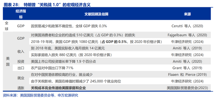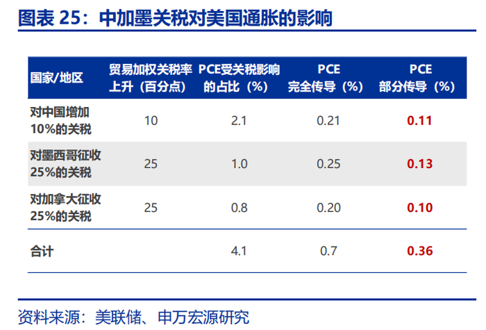 美国经济正处在放缓阶段,关税同样会将强化“滞”的风险。较确定的是,关税的通胀效应是“临时的”,但“滞”的风险是否演变为真实的“衰退”是不确定的。所以,短期内,美联储政策反应函数中“滞”的权重或大于“胀”。1)各项测算大致认为特朗普关税1.0对美国实际GDP的负向冲击为0.3-0.5个百分点(ITC,2023);2)关税2.0背景下,仅中加墨关税就或使美国GDP下跌0.4至1.3个百分点。若美国仅实施对中国的10%及对加拿大、墨西哥的25%关税,或导致美国GDP下降0.4个点,其中对加拿大和墨西哥加征关税的影响更大,对中国加征的影响稍低。若美国未来实施全球关税并扩大对华关税力度,则可能会使美国GDP下降1.3个百分点。