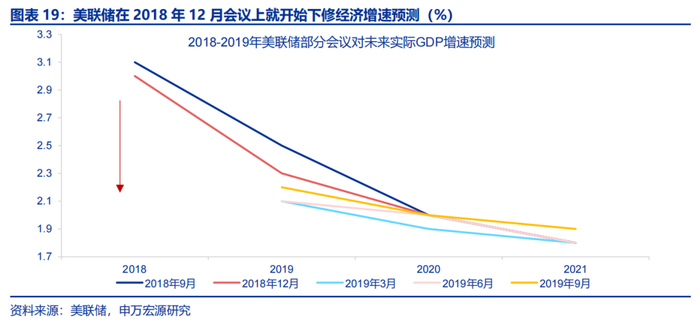 面对经济走弱、市场震荡,美联储在2018年底开始转向,并于2019年7月开启降息。鲍威尔2018年11月发言初步传递偏鸽信号。美联储2018年12月会议将加息次数、经济增速预测下调。表述上,美联储于2018年11月后开始强调企业投资、出口走弱,直至降息开启。