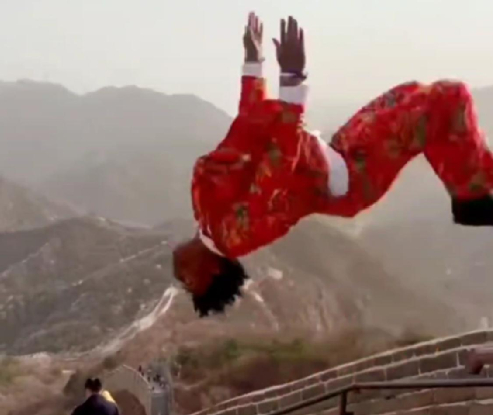 在长城上表演后空翻。