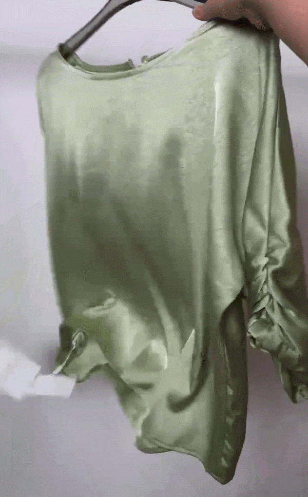 带一点褶皱肌理,缎面光泽感,经过立体剪裁成衣,上身有空气感的宽松廓形,飘逸、随性、很显贵!