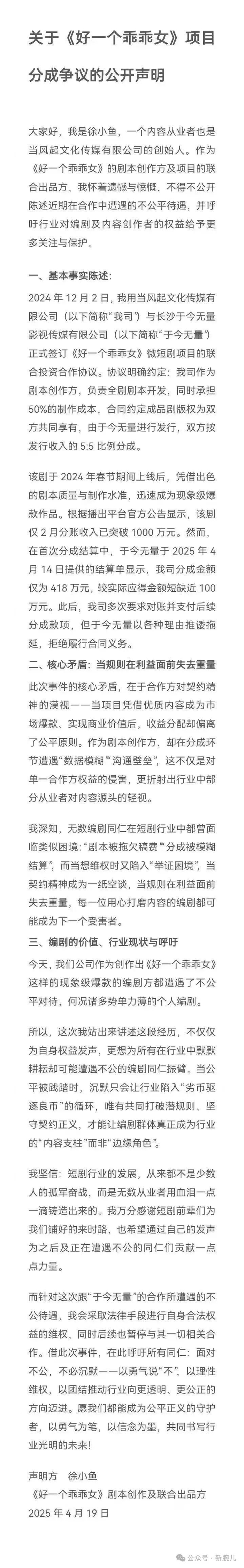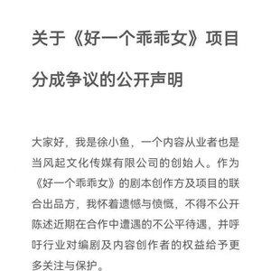4月19日,《好一个乖乖女》剧本创作方及项目联合出品方“当风起文化传媒公司”创始人徐小鱼发布一则——关于《好一个乖乖女》项目分成争议的公开声明。
