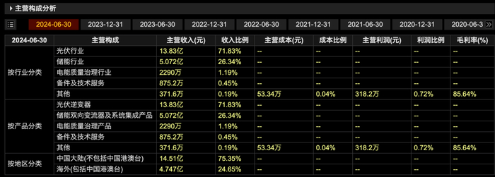 按产品划分,2024年上半年,光伏逆变器为公司贡献了超七成的收入,为13.83亿元,储能双向变流器及系统集成产品收入5.07亿元,占总收入的比重为26.34%。