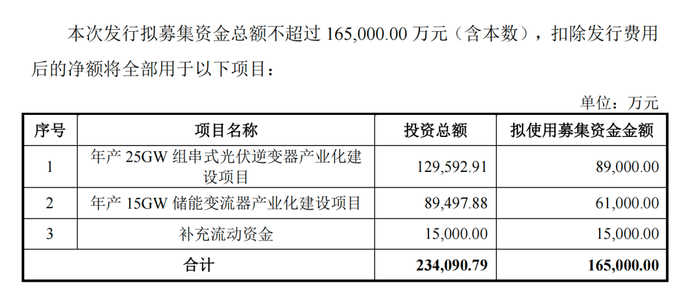 具体来看,公司拟向特定对象发行股票募集资金16.5亿元,扩产光伏逆变器及储能变流器,新增产能分别为25GW、15GW,达现有产能的2.08倍、2.73倍。