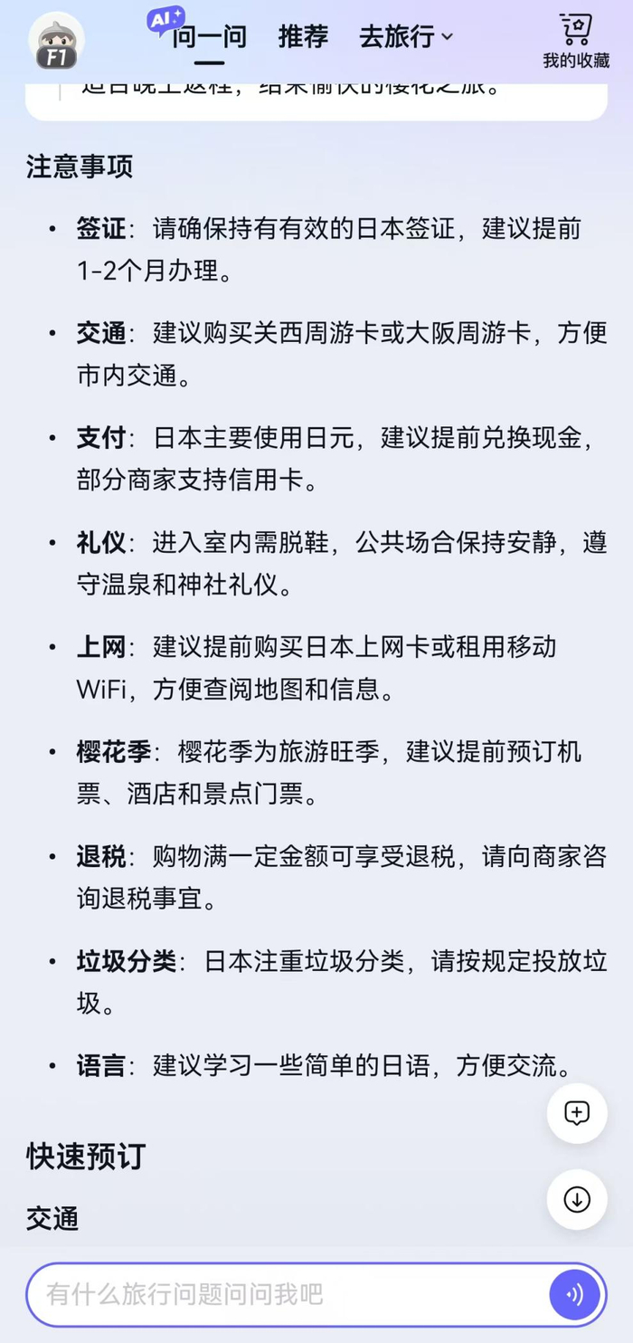 比如在“去大阪看樱花”的规划里,飞猪AI不会回推荐当地有名的赏樱地点,更是会像沙和尚一样提醒你:签证需要提前1-2月办理,建议购买关西周游卡或大阪周游卡,提前准备现金、进入室内需脱鞋、退税技巧等等。这些看似琐碎却又关乎旅行体验的细节,就像一直挑着重担的沙和尚,随时没有这些“后勤保障”,取经之路也会磕磕绊绊。