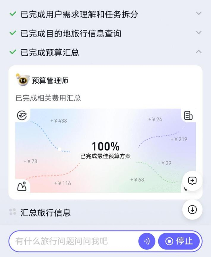 目前,这款产品在很多细节上还有需要解决和补齐的地方,比如面对复杂需求、多人多程安排时等待时间较长,想去一些小众目的地参观可能推荐不全,预算方案的设想虽好但是还不能识别多人分摊房费、儿童折扣优惠等问题,很难百分百替代人脑,尤其是对于经常出门的旅行达人来说,更像是一个出行的“好帮手”。