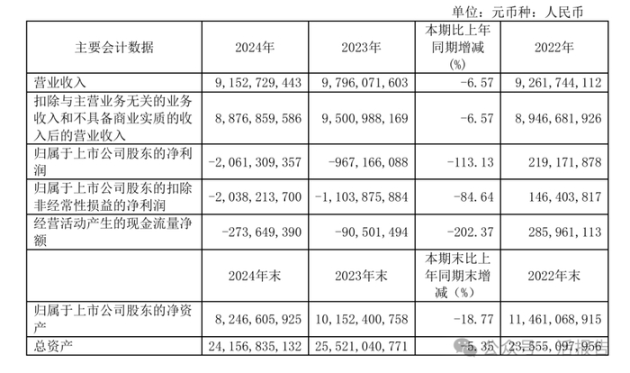 根据2024年年报,公司营收91.53亿元,同比下滑6.57%;净利润-20.61亿元,同比下滑113.13%
