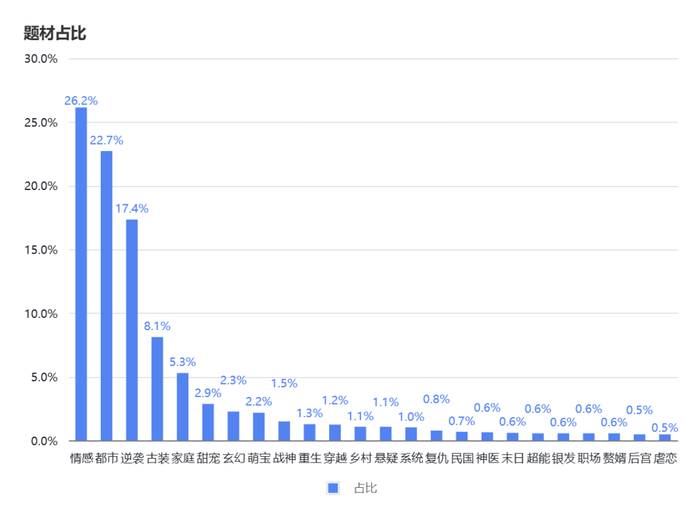 在这种情况下,逆袭、感情、都市正取代曾经的复仇、战神、赘婿,而民国题材、职场题材、虐恋题材、穿越题材……具备更可观的潜力。