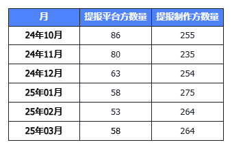 据WETRUE数据,在2024年10月,提报平台方数量86个,制作方255个,到2025年1月平台方数量58个,制作方275个,再到3月份平台58个,制作方264个。会明显发现,提报的制作方数量具备增长趋势,而平台方数量在显著下降。