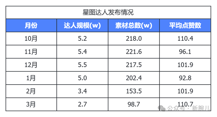 就在这种情况下,平均点赞数却在达人规模和素材总数最低的25年3月时达到110.7。