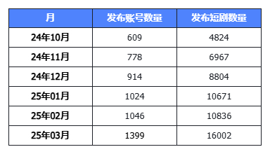 再将时间线拉到近半年内,端原生发布短剧的账号数量在六个月内翻倍,而发布短剧的数量在六个月内,从4824个增加至16002个,翻了三倍不止。
