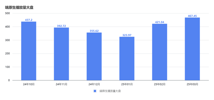 从2024年10月至12月,端原生播放量大盘从437.2亿至392.72亿、355.62亿,开年后,阔别了下行曲线,端原生从2025年1月的323.97亿上升至3月的467.45亿。